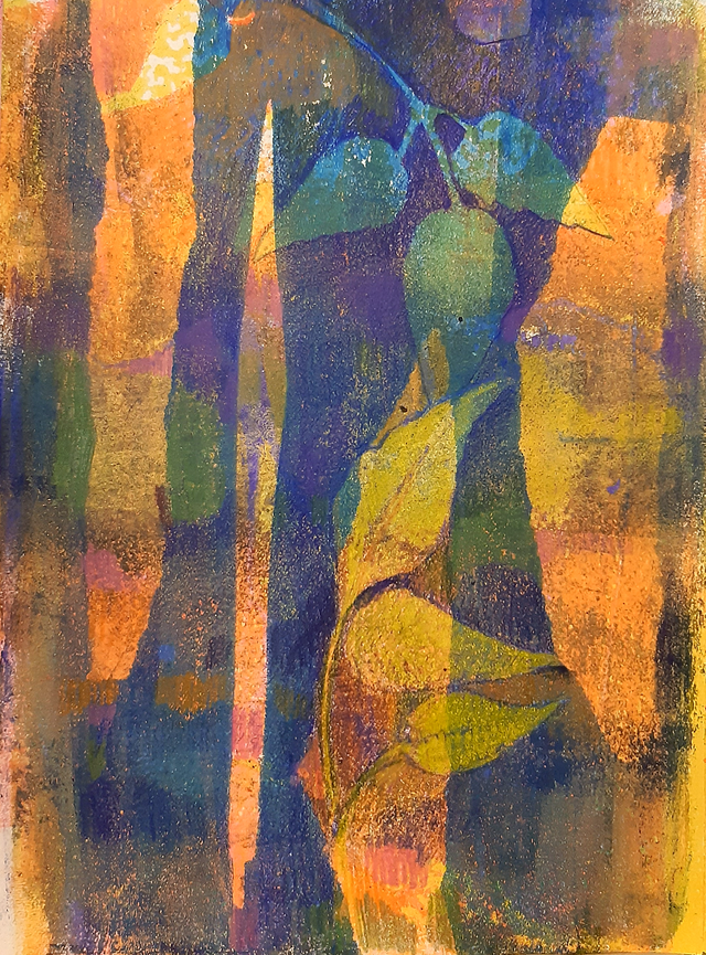 Feuilles abstraites monotype acrylique et crayons sur papier.